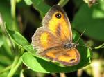 Latin name - Pyronia tithonus Flight period - June to September Wingspan 3.7 to 4.8 cm, 1.5 to 1.9 inch. The Gatekeeper is a medium-sized brown butterfly which is on the wing in the summer, found in grassland, hedgerows and woodland edges. It is also known as the Hedge Brown. It is brown above, with large orange patches in the middle of the wings. It has one large eyespot on the forewing, one smaller eyespot on the hindwing and two small white 'pupils' in the eyespots. Favourite nectar sources include Wild Marjoram, Common Fleabane, Ragworts, and Bramble. |